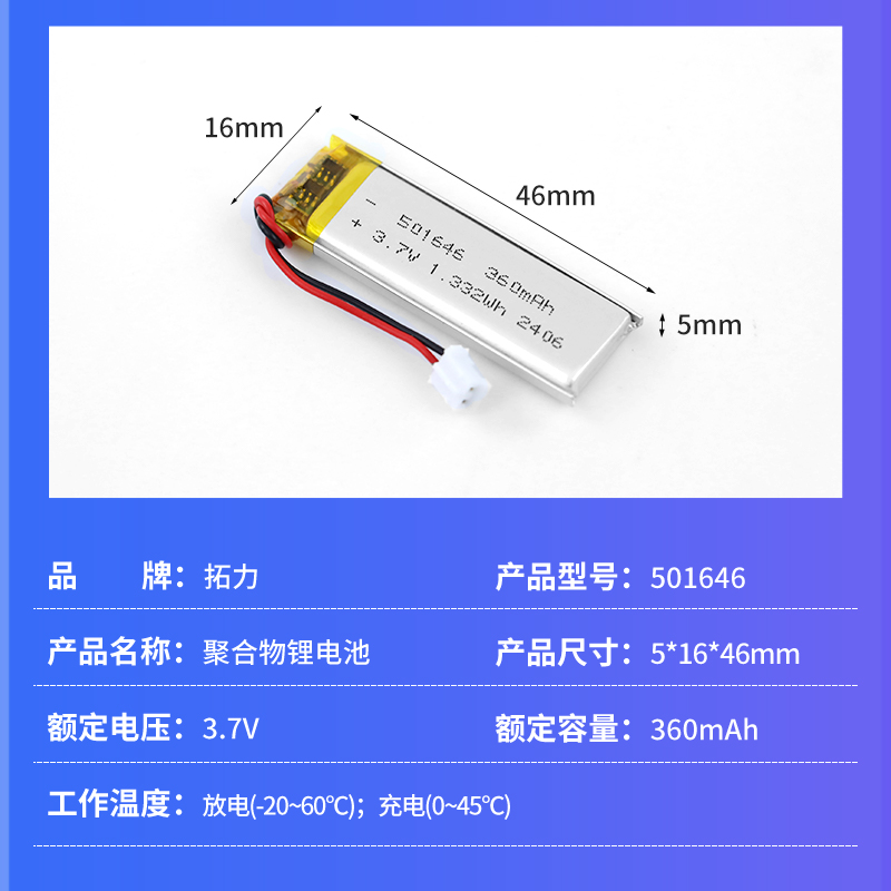 3.7V1800mah 103450 聚合物鋰電池東莞市拓力新能源科技有限公司成立于2017年,專業(yè)生產(chǎn)數(shù)碼電池、工業(yè)電池、動力電池,壁掛式儲能電池、鉛酸電池研發(fā)、太陽能模組、特種需求電池等電池相關(guān)產(chǎn)品